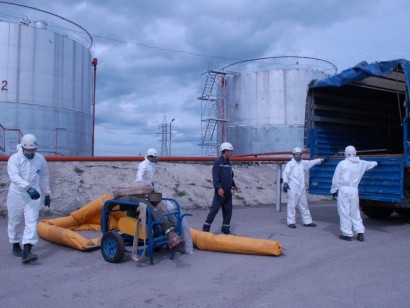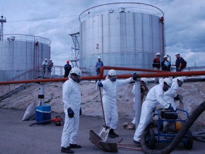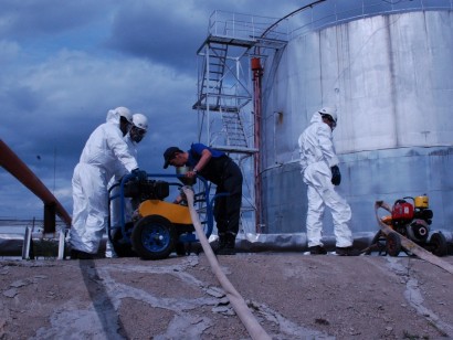 В результате трещины в емкости № 1 происходит разлив жидкого топлива в обваловку.